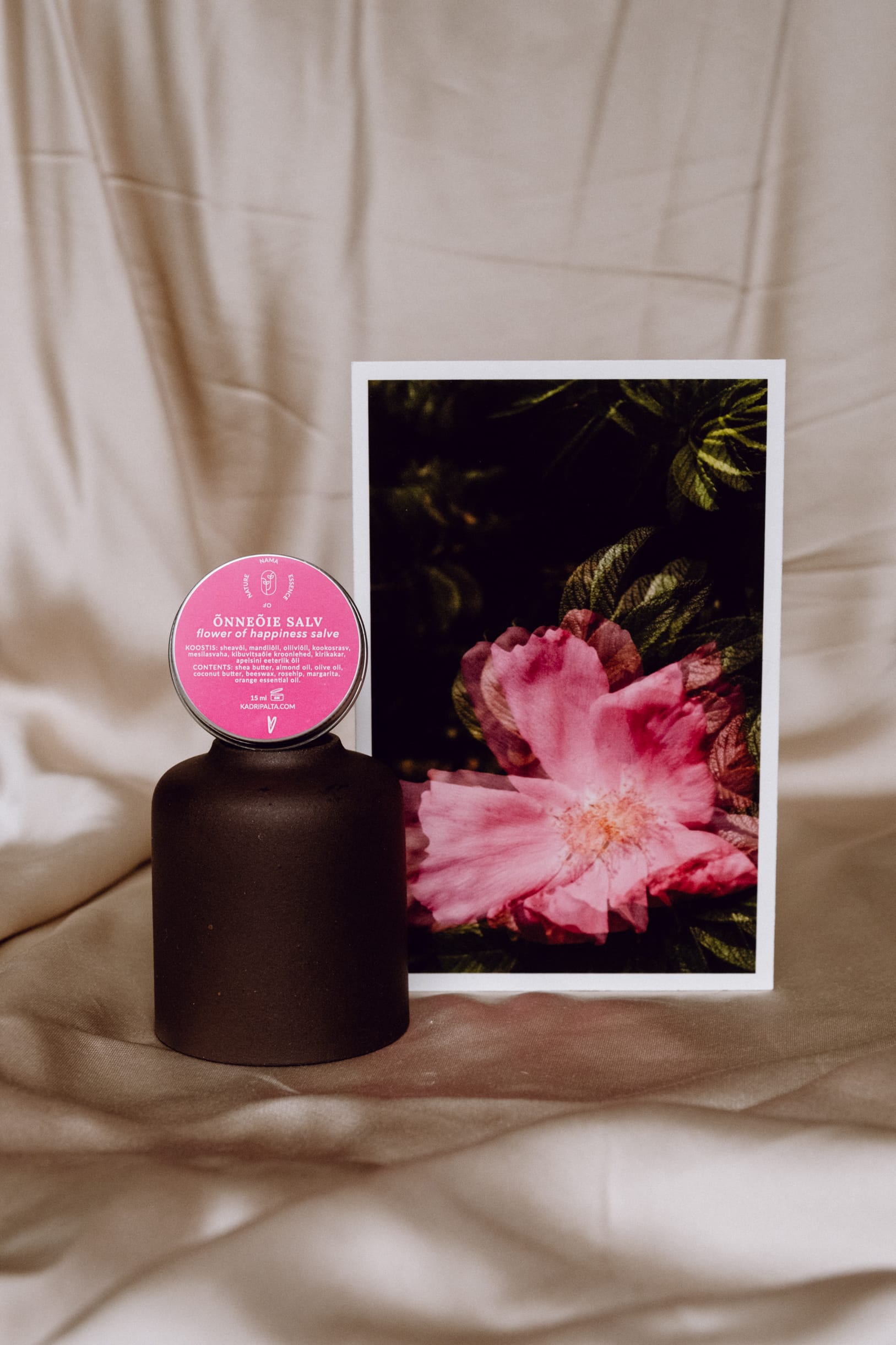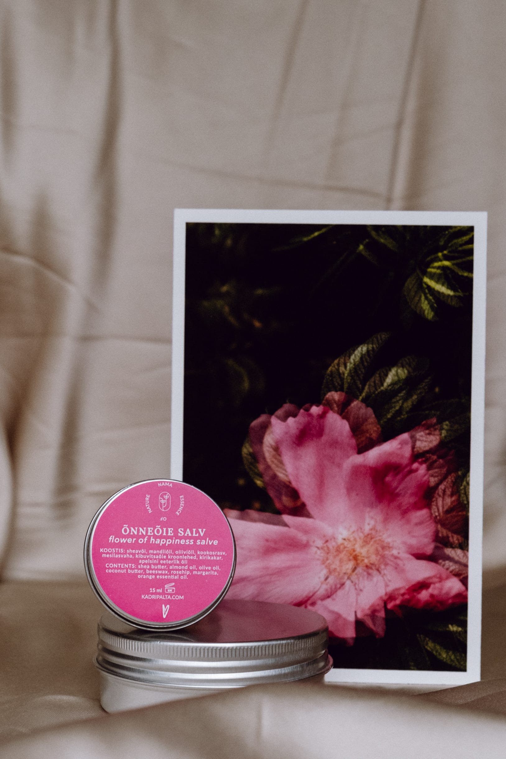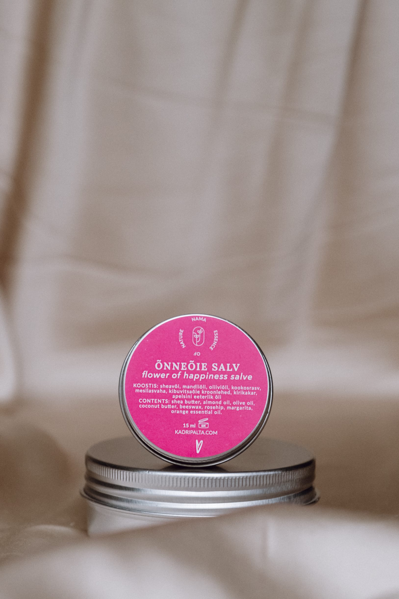 Taimede väega õnneõie salv kibuvitsaõite kroonlehtede, sireliõitega ja magusa apelsini õliga.